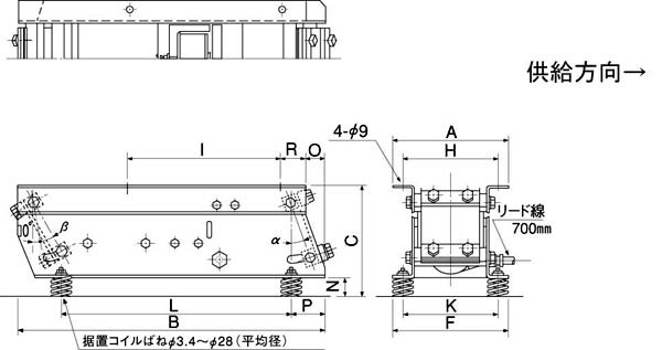 LF系列sinfonia_shinko_神鋼電機(jī)供料機(jī)(繞線式彈簧防震型) 外形尺寸圖 樣式 形式 板ばね取付け角度 定格電圧(V) 定格電流(A) 振動(dòng)數(shù)(Hz) 質(zhì)量(kg) 標(biāo)準(zhǔn)適用 コントローラ α β LF-30 0゜~20゜ 10゜~30゜ 200/220 1.5 50/60 25 C4-5B C10-3VF LF-40 0゜~20゜ 10゜~30゜ 200/220 1.6 50/60 33 尺寸表 単位:mm 形式 A B C F H I K L N O P R LF-30 182.4 410 162 180.4 156.4 190 150.4 295 30 30 55 40 LF-40 196.4 500 177 186.4 166.4 250 154.4 375 30 30 55 40 sinfonia_shinko_神鋼電機(jī)供料機(jī)式樣 単位:mm 適 用 直進(jìn)式sinfonia_shinko_神鋼電機(jī)供料機(jī) 最大長(zhǎng) 最大幅 最大質(zhì)量 (kg) LF-30 650 120 3.5 LF-40 750 150 5.5