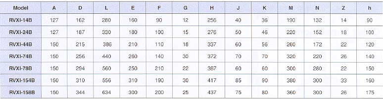 RVXI型振動電機 ■標準式樣 形式 加振力 (kg) 電圧 (V) 周波數(shù) (Hz) 出力 (kW) 振動數(shù) (VPM) 定格 取付ボルト (A) 重量 (kg) 検定合格番號 第○○○○○號 RVXI-14B 250 200/220 50/60 0.1 1500/1800 連続 M12 24 13050 400/440 RVXI-24B 500 200/220 50/60 0.2 1500/1800 連続 M16 33 13090 400/440 RVXI-44B 800 200/220 50/60 0.4 1500/1800 連続 M20 53 13091 400/440 RVXI-74B 1600 200/220 50/60 0.75 1500/1800 連続 M24 92 35571 400/440 RVXI-78B 1000 200/220 50/60 0.75 750/900 連続 M20 112 26311 400/440 RVXI-154B 3200 200/220 50/60 1.5 1500/1800 連続 M30 156 14152 400/440 RVXI-158B 2000 200/220 50/60 1.5 750/900 連続 M24 206 13093 400/440 ■外形尺寸圖 單位:mm 尺寸表 單位:mm