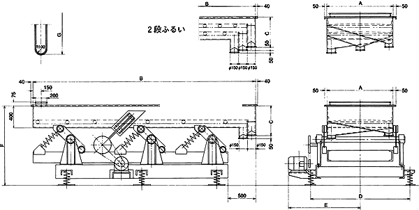 SBM型sinfonia_shinko_神鋼電機(jī)振動(dòng)篩系列 ■標(biāo)準(zhǔn)式樣 ●一段ふるい 形 式 有効ふるい 面積(m2) モータ出力 (kW×臺(tái)數(shù)) 振動(dòng)數(shù) (回/分) 重量 (kg) SBM- 450-2.5 0.7 1.5×1 450~650 1100 SBM- 600-2.5 1.0 2.2×1 450~650 1400 SBM- 600-3.0 1.2 2.2×1 450~650 1500 SBM- 750-2.5 1.3 2.2×1 450~650 1750 SBM- 750-3.0 1.6 3.7×1 450~650 1900 SBM- 900-2.5 1.6 3.7×1 450~650 2200 SBM- 900-3.0 2.0 3.7×1 450~650 2300 SBM- 900-3.5 2.4 3.7×1 450~650 2600 SBM- 1200-3.0 2.7 2.2×2 450~650 3000 SBM- 1200-3.5 3.3 3.7×2 450~650 3200 SBM- 1200-4.0 3.8 3.7×2 450~650 3550 SBM- 1500-3.5 4.2 3.7×2 450~650 4100 SBM- 1500-4.0 4.9 3.7×2 450~650 4650 ●2段ふるい 形 式 有効ふるい 面積(m2) モータ出力 (kW×臺(tái)數(shù)) 振動(dòng)數(shù) (回/分) 重量 (kg) SBM- 450-2.5 0.68 1.5×1 450~650 1300 SBM- 600-2.5 0.98 2.2×1 450~650 1650 SBM- 600-3.0 1.15 2.2×1 450~650 1750 SBM- 750-2.5 1.2 3.7×1 450~650 2050 SBM- 750-3.0 1.5 3.7×1 450~650 2200 SBM- 900-2.5 1.5 3.7×1 450~650 2550 SBM- 900-3.0 1.85 3.7×1 450~650 2650 SBM- 900-3.5 2.25 2.2×2 450~650 3000 SBM- 1200-3.0 2.8 3.7×2 450~650 3450 SBM- 1200-3.5 3.6 3.7×2 450~650 3700 SBM- 1200-4.0 3.7 3.7×2 450~650 4100 SBM- 1500-3.5 4.0 3.7×2 450~650 4700 SBM- 1500-4.0 4.7 3.7×2 450~650 5400 ■外形尺寸圖 ■尺寸表 単位:mm 形式 A B C D E(MAX) F G SBM- 450 450 2500 - - - 650 1000 約 820 約1425 400 SBM- 600 600 2500 3000 - - 650 1150 約 940 約1425 500 SBM- 750 750 2500 3000 - - 650 1350 約1040 約1425 650 SBM- 900 900 2500 3000 3500 - 650 1500 約1270 約1425 800 SBM-1200 1200 - 3000 3500 4000 650 1800 約1420 約1525 1100 SBM-1500 1500 - - 3500 4000 650 2100 約1570 約1525 1400